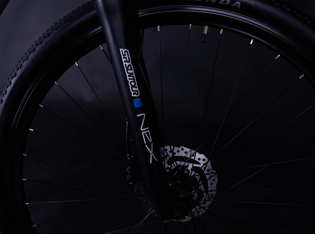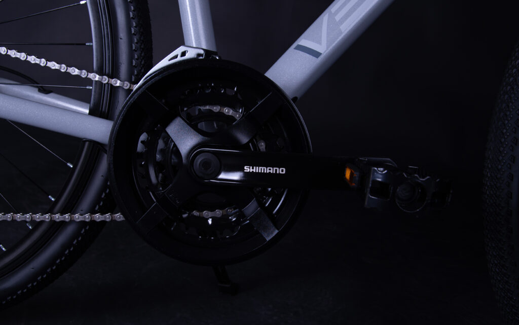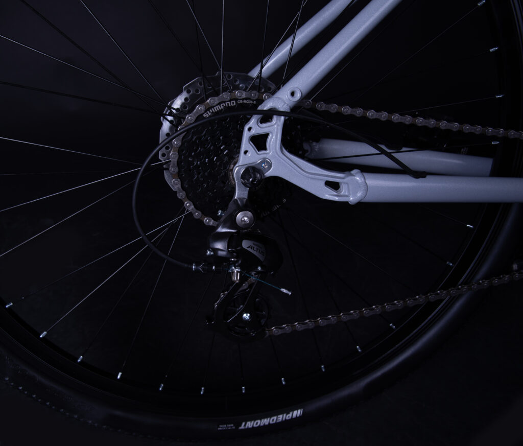 Rower wyposażony jest w napęd z tylną przerzutką Shimano Altus, który zapewnia płynną i precyzyjną zmianę biegów. Jest to sprawdzony osprzęt renomowanej marki Shimano, ceniony za trwałość oraz niezawodne działanie podczas codziennej jazdy rekreacyjnej i trekkingowej. W połączeniu z przednią przerzutką Shimano Tourney oraz układem 3×8 (24 biegi) pozwala łatwo dobrać odpowiednie przełożenie zarówno na płaskich odcinkach, jak i podczas podjazdów. Za skuteczne i pewne hamowanie odpowiadają hydrauliczne hamulce tarczowe Shimano MT200. Charakteryzują się one dobrą siłą hamowania oraz wysoką modulacją, dzięki czemu rower zatrzymuje się pewnie w różnych warunkach pogodowych. Hydrauliczny układ hamulcowy wymaga również mniejszej siły nacisku na klamkę, co zwiększa komfort i bezpieczeństwo jazdy.